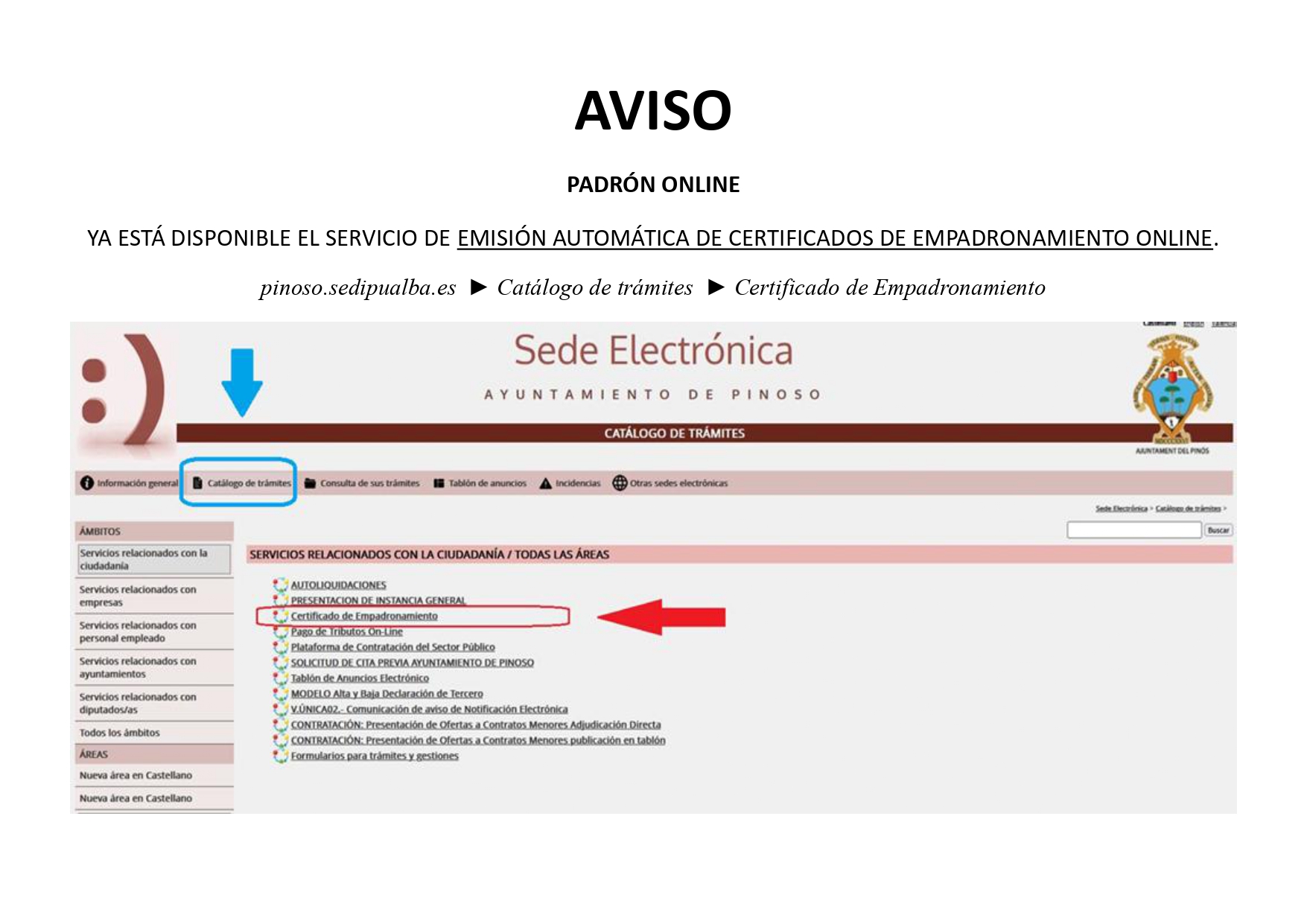 El departamento de Estadística del Ayuntamiento de Pinoso ha puesto en marcha una nueva herramienta que permite gestionar la obtención de certificados de empadronamiento desde la sede electrónica, sin necesidad